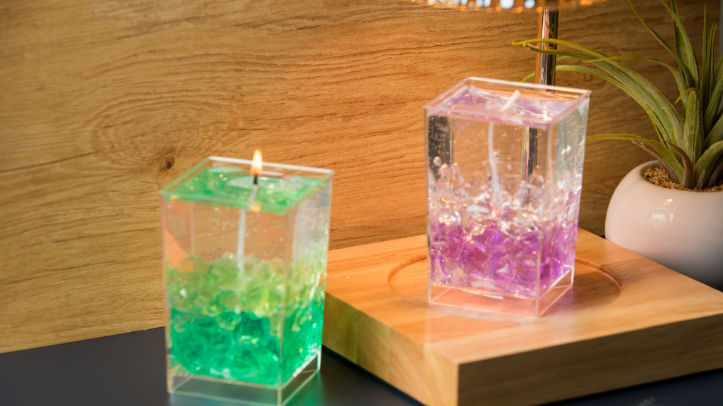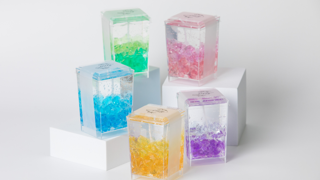 キラキラジュエルが入ったキャンドルは、天然100%オリジナル精油の優しい香りが特徴です。