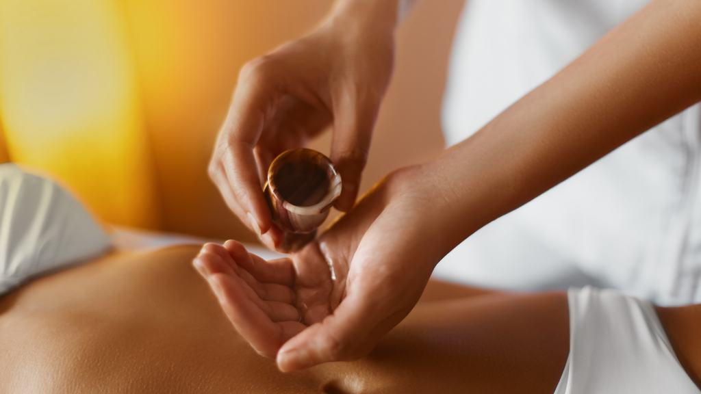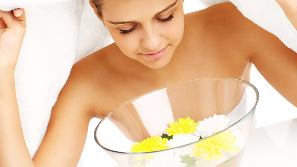 顔に精油成分を含んだ蒸気をあてることにより、血行を促進し、皮膚に潤いを与えます。